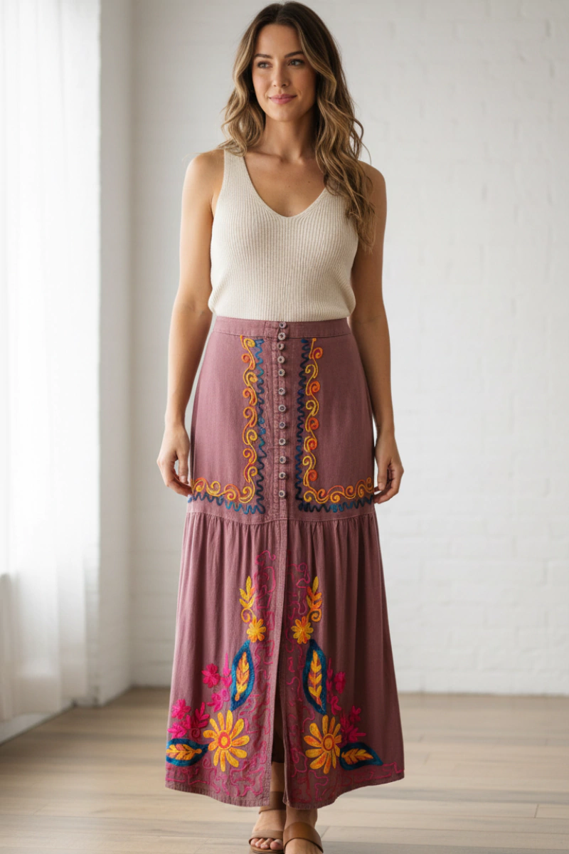 -Saia Longa com trabalhado bordado e fenda na parte da frente,modelo reto